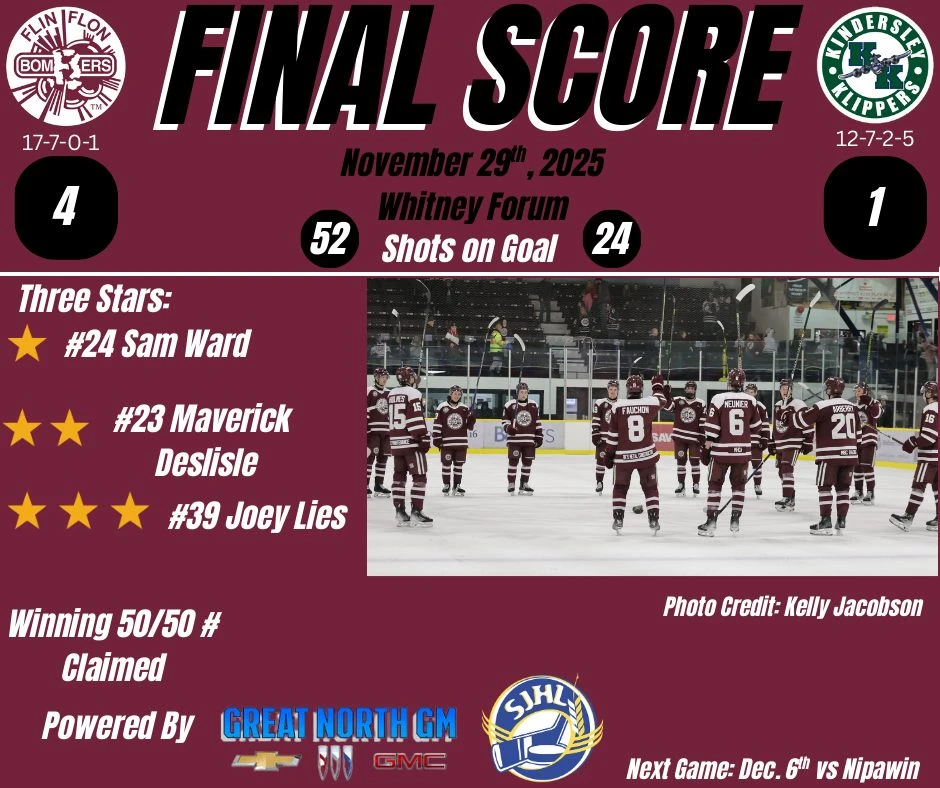 Flin Flon came out flying in the third and scored three more times with a pair of goals from Reid Arberry including his second of the night which tied the game with only 44 seconds remaining at 6. The other Bomber goal came from Joey Lies who scored his second of the night and 11th of the season.
