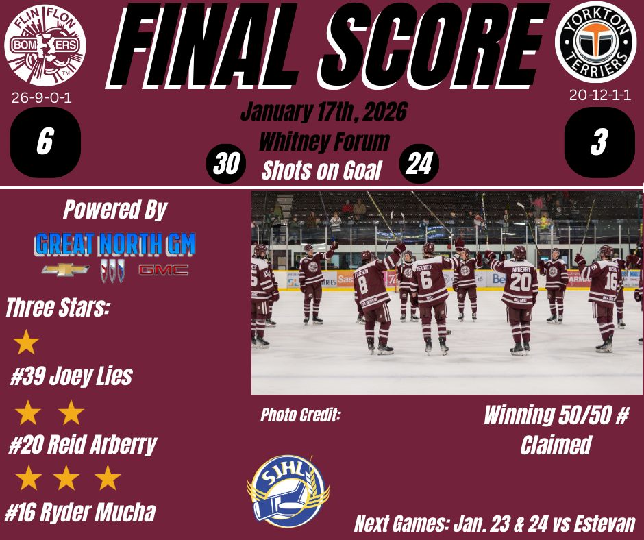 This was a very gutsy and impressive win for the Bombers who pulled off the win on the road with 9 regulars out of their lineup. Flin Flon was missing Joey Lies, Reid Arberry and Sam Ward who suited up for the SJHL at the Viking Cup.