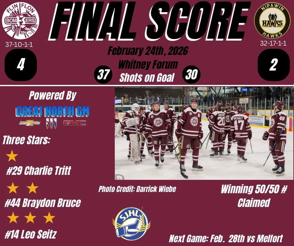 The good news is that Flin Flon was able to respond after the loss and now sit first overall at 34-10-1-1, 70 points which is 5 up on the second place Battleford Stars and 8 points up on the third place Yorkton Terriers.